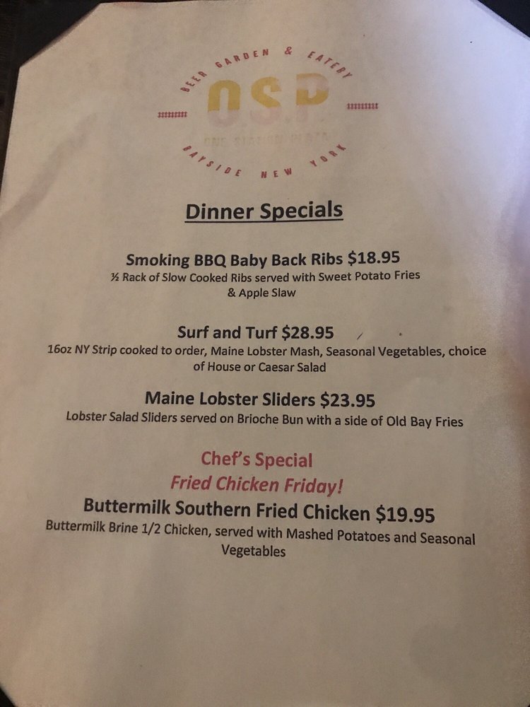 “ OSP was the perfect place -- great service, roomy, friendly atmosphere, good drinks -- for this year's Flushing Boys/Girls Club get together with friends we knew from 50 years ago... and made some new ones. Back then, we enjoyed softball, basketball, football, track, chess, pool, ping pong and much more. It kept us off the street and helped us build character and determination. We shared stories from 'back in the day' and caught up on each others' lives. ”